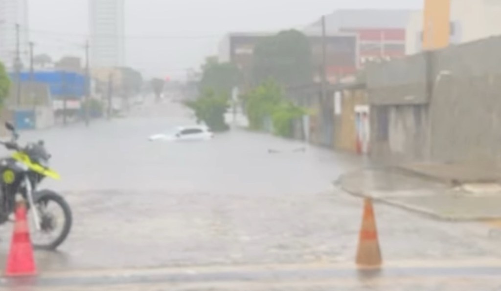 Carro fica submerso na rua José Gonçalves em Lagoa Nova, por trás do Nordestão.