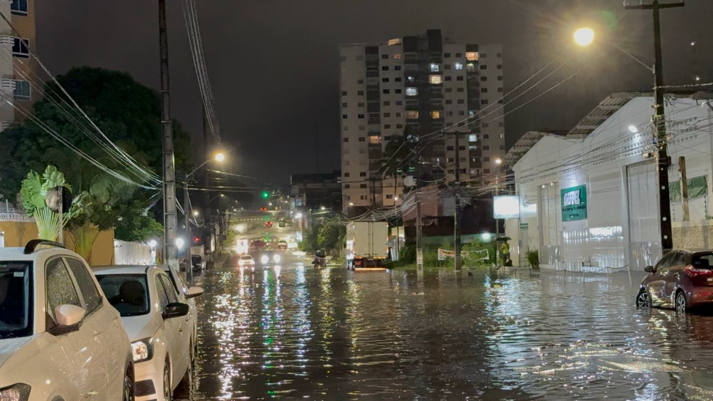🚫 Avenida Amintas Barros, entre a Rua dos Caicóis e a Avenida Interventor Mário Câmara – totalmente alagada e intransitável.