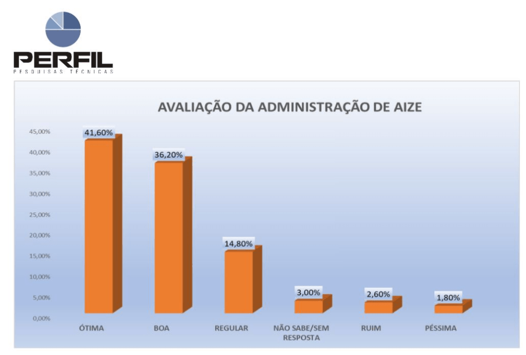 Pesquisa realizada pelo Instituto Perfil revela que 41,60% da população de João Câmara dizem que gestão de Aize Bezerra é ótima; 36,20% avaliam a gestão como boa; 14,80% dizem que a gestão é regular; 3% não sabe/sem resposta; 2,60% avaliam como ruim; 1,80% avaliam como péssima.