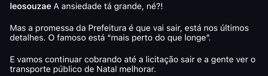 O vereador Léo Souza (Republicanos) parece ter se afastado da base aliada do prefeito Paulinho Freire. Na noite desta quarta-feira, o parlamentar publicou em seu perfil no Instagram um card cobrando a realização da licitação do transporte público de Natal — um tema estratégico que está sendo enfrentado pela gestão municipal.
