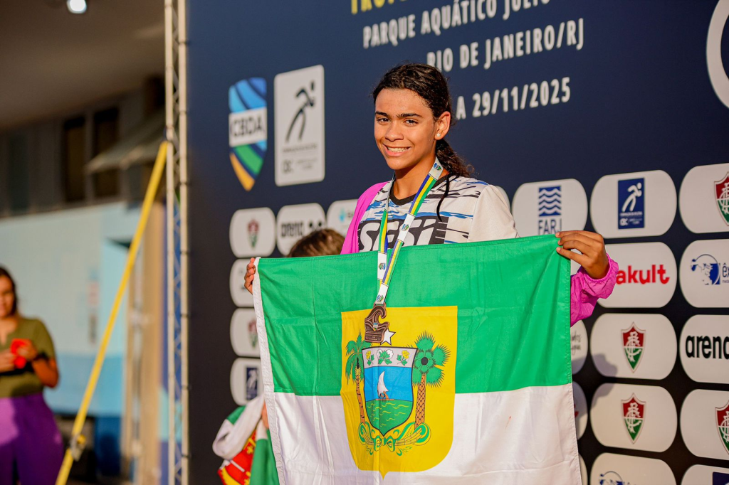 A nadadora potiguar Cecília Melo, da equipe do SESI Clube, conquistou de forma inédita a medalha de bronze nos 200 metros Nado Livre durante o Campeonato Brasileiro Infantil de Verão – Troféu Maurício Bekenn 2025. A competição acontece de 25 a 29 de novembro, na piscina do Parque Aquático Júlio Delamare, no Rio de Janeiro (RJ). Além do bronze conquistado, Cecília também voltou a estabelecer novo recorde absoluto, após ter nadado os 1.500 m Livre, fazendo 18:30.39.